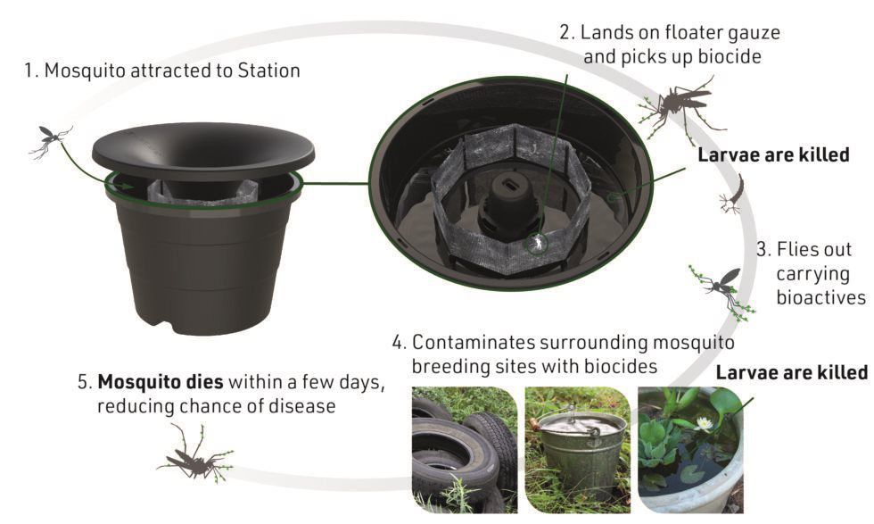 Our mosquito stations is made from durable recycled polypropylene (PP), which lasts several years under tropical conditions. The gauze strip on the floater needs to be replaced every 4-6 weeks for optimal activity. We recommend area-wide outdoor deployment, using densities of approximately 2 Station to cover 8000 sqft in high risk areas with many Aedes or Culex mosquito breeding sources. During mosquito season, a single treatment is usually not enough to eliminate mosquitoes completely. We recommend a series of treatments to achieve long-term control. This is because mosquitoes have a relatively short life cycle and can quickly repopulate an area that has been treated. Monthly services start at $179-$199 setup and $40-$65/month to change station and gauze and to douse monthly with IC3 as preventative and repellant from those Culex and Aedes Agypti (anke biters) mosquitos.